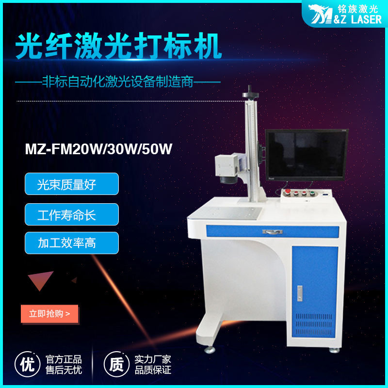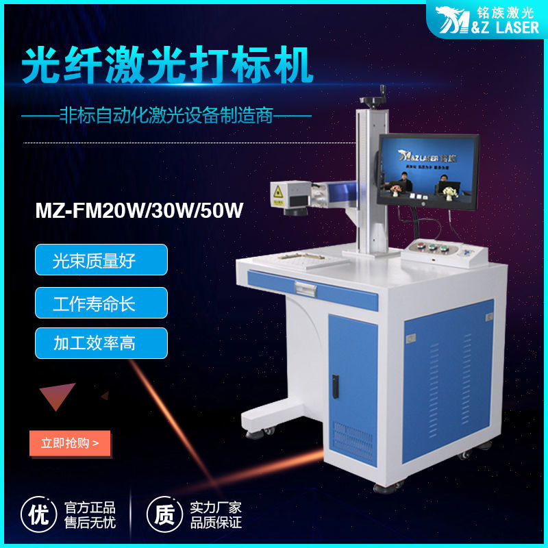 MZ-FM-20/30/50/100W-R光纖激光打標(biāo)機(jī)是我公司運(yùn)用現(xiàn)今世界上先進(jìn)的激光技術(shù)研制而成的新一代激光打標(biāo)機(jī)系統(tǒng)。采用武漢銳光纖輸出激光,再經(jīng)高速掃描振鏡系統(tǒng)實(shí)現(xiàn)打標(biāo)功能。光纖激光打標(biāo)機(jī)電光轉(zhuǎn)換效率高,達(dá)到30%以上,采用風(fēng)冷方式冷卻,整機(jī)體積小巧,輸出光束質(zhì)量好,可靠性高??傻窨探饘俨牧虾筒糠址墙饘俨牧?,主要應(yīng)用于對深度、光滑度、精細(xì)度要求較高的領(lǐng)域,如鐘表、首飾、模具行業(yè),位圖打標(biāo)等。